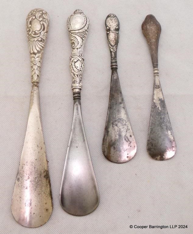 Antique Collection of Sterling Silver Mounted Shoe Horns. Various Hallmarks. Length 18 – 24.5 cm. (4 Items)