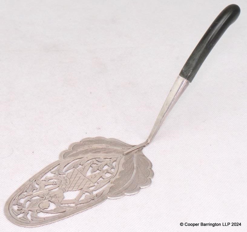 Indian Silver Plated Cake Slice with Pierced Decoration and Ebony Hardwood Handle. Early 1900s. Sindhi marking. Length 24 cm.