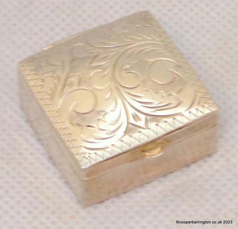 Engraved Square Silver Pill Box with Hinged Lid. Marked Sterling. 2.7 x 2.7 cm.