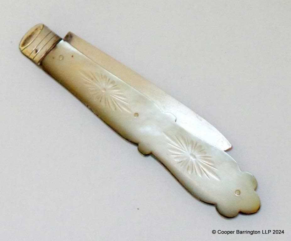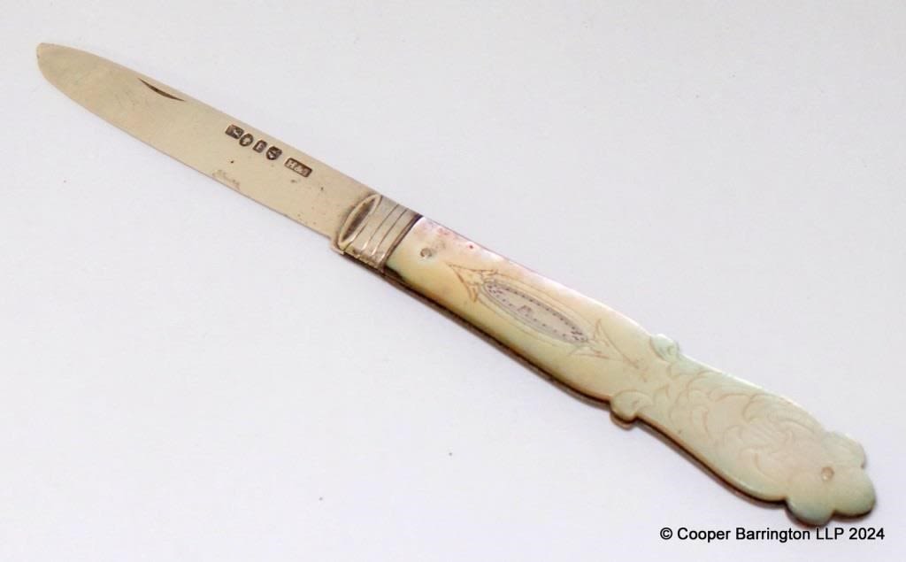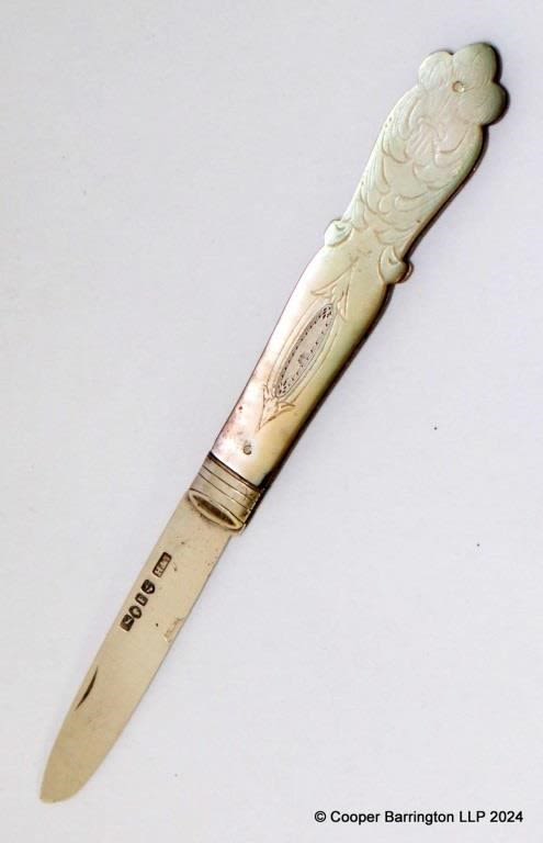 Victorian Sterling Silver Fruit Knife with Carved Mother of Pearl Handle by Hilliard & Thomason. Hallmarked Birmingham 1854. Length open 14.5 cm.