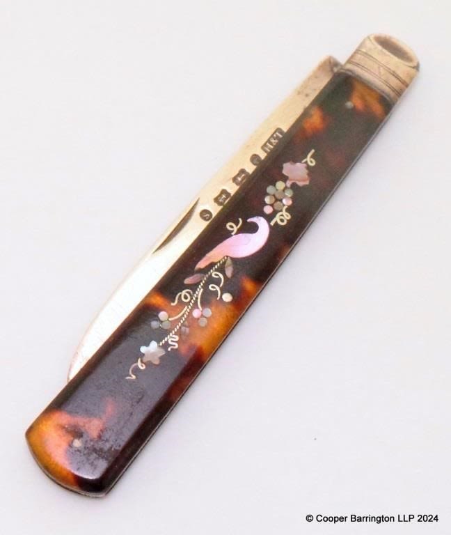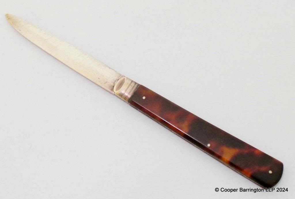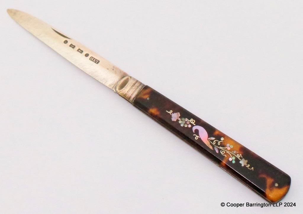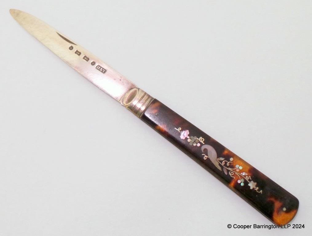 Scarce Victorian English Tortoiseshell Pique Work and Sterling Silver Fruit Knife by Hilliard & Thomason. Hallmarked Birmingham 1867. Length open 13.7 cm.