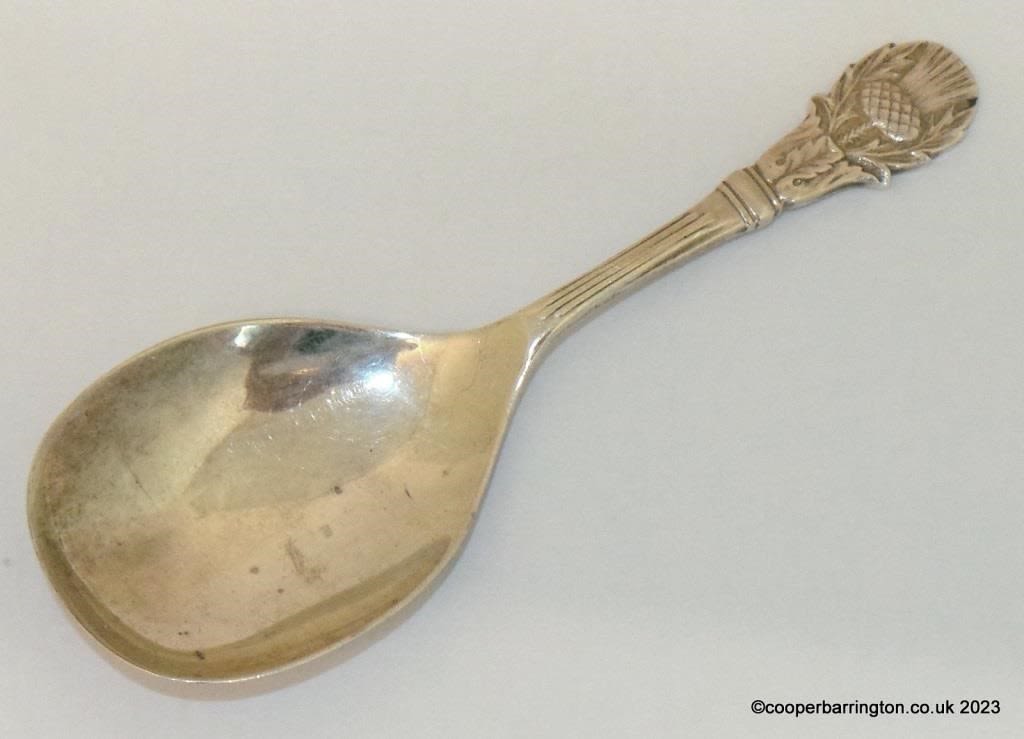 QEII Sterling Silver Caddy Spoon with Thistle Finial by C.Robathan & Son. Hallmarked Birmingham 1956.