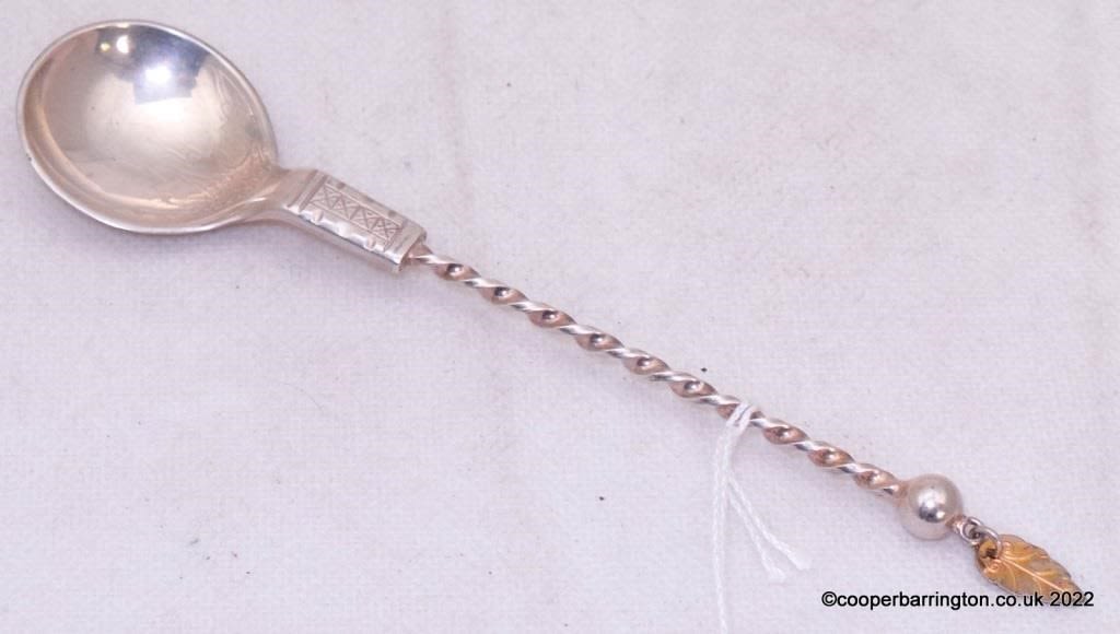 Norwegian Engraved Silver Caddy Spoon with Gilded Floating Leaf Finial. Marked 830S for Sylvsmidja of Voss. Length 14.5 cm.