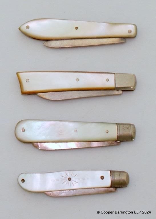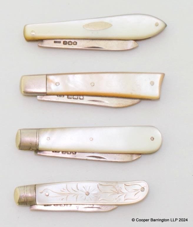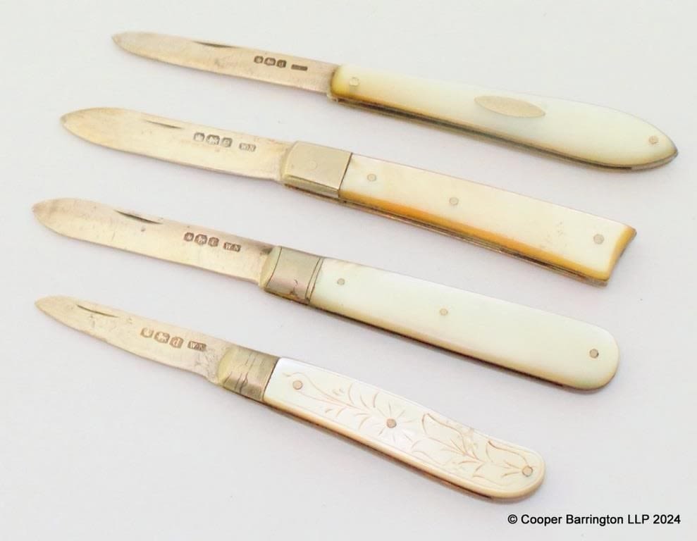 KGV English Mother of Pearl and Sterling Silver Fruit Knives by William Needham and John Yeomans Cowlishaw.Hallmarked Sheffield 1921-23. Length open 11-9.2 cm. (4 Items)