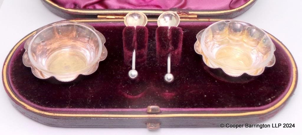 Cased Victorian Sterling Silver Salts Set. Circa 1886. Complete with two salt bowls with gilded interiors,glass liners and matching spoons. Case lined with royal purple satin/velvet.