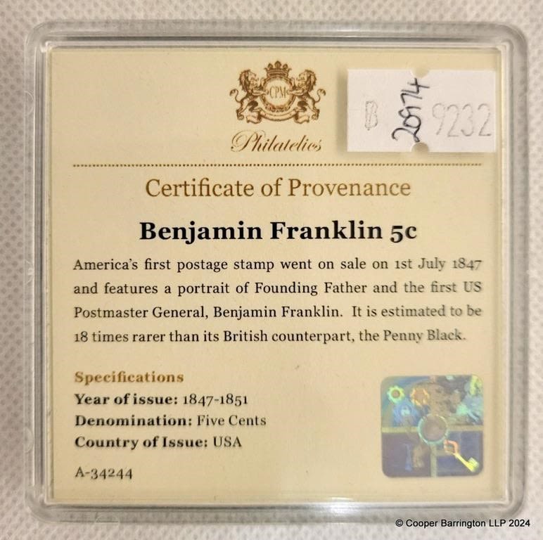 United States1847 Benjamin Franklin 5c Pale Brown. US Scott 1.With Philatelics Certificate.