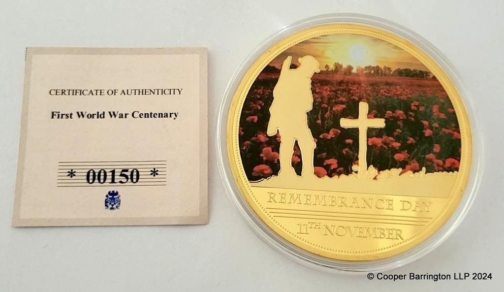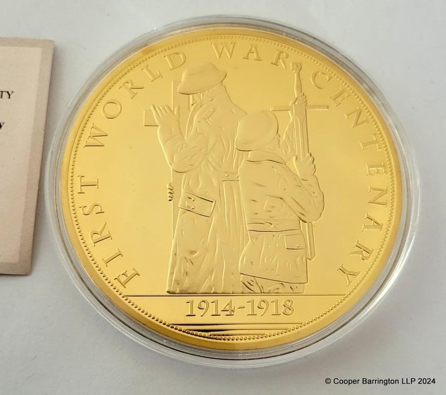 QEII 2017 Rememberance Day 1914-1918 Gold Plated Proof Coin. Diameter 70mm. Complete with COA No.00150.