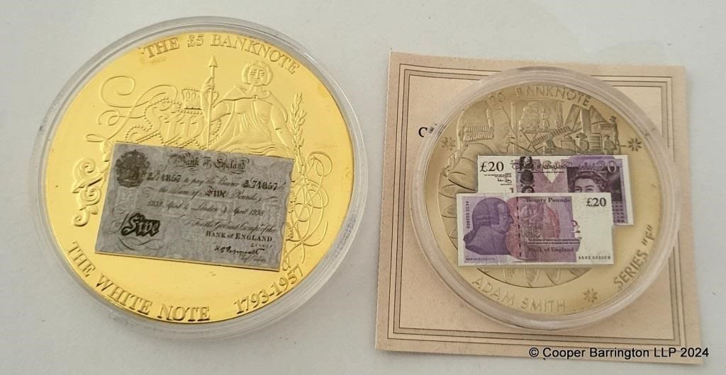 British Bank Note Coins to Include: £5 White Five Pound Note and 2007 £20 Note with COA. (2 Items)