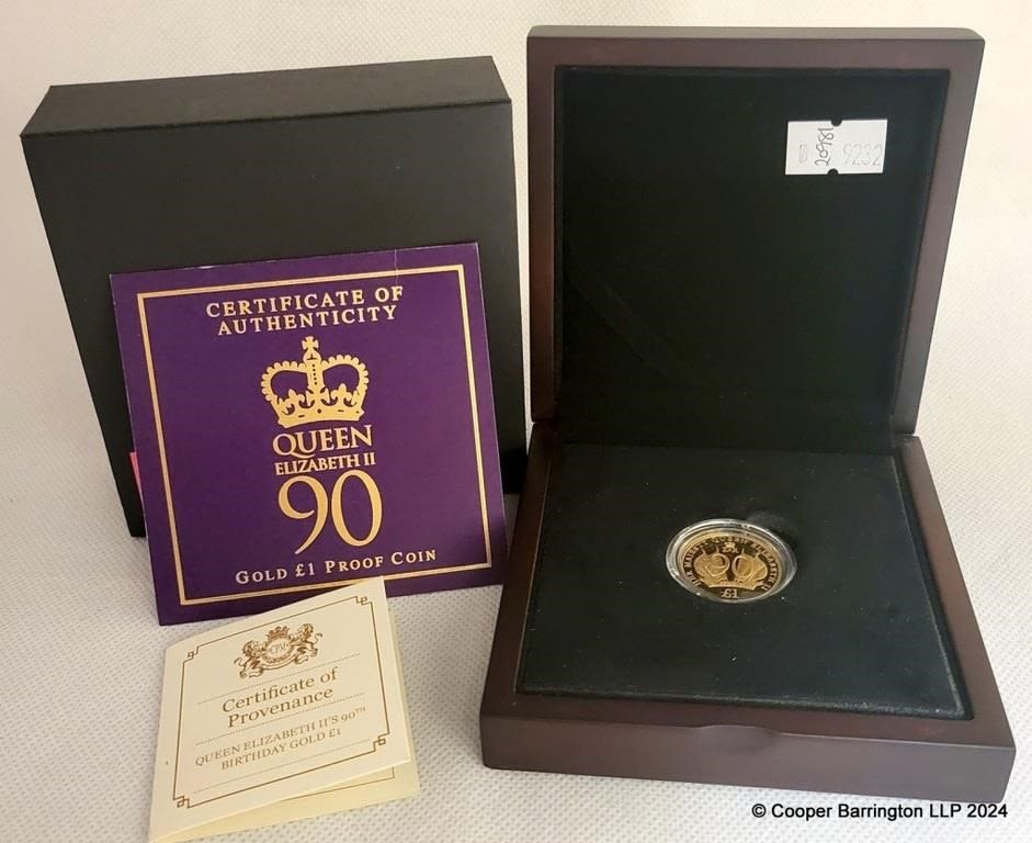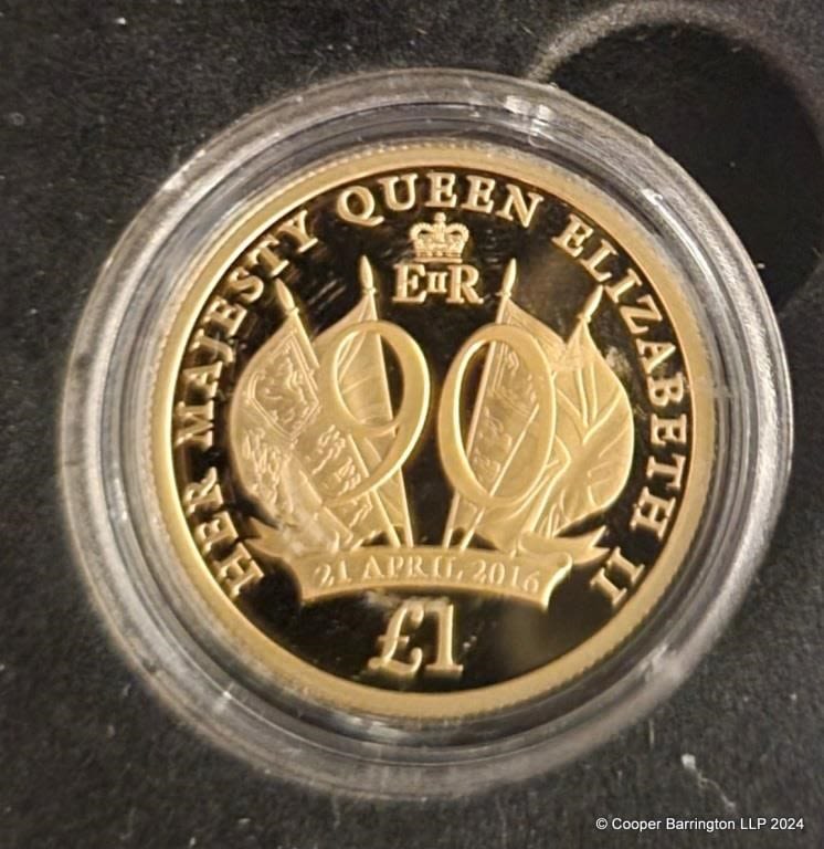 QEll 90th Birthday 2016 Bailiwick of Jersey £1 Gold Proof Coin (1/4 oz). Limited Edition 995. No.335. Boxed with COA.
