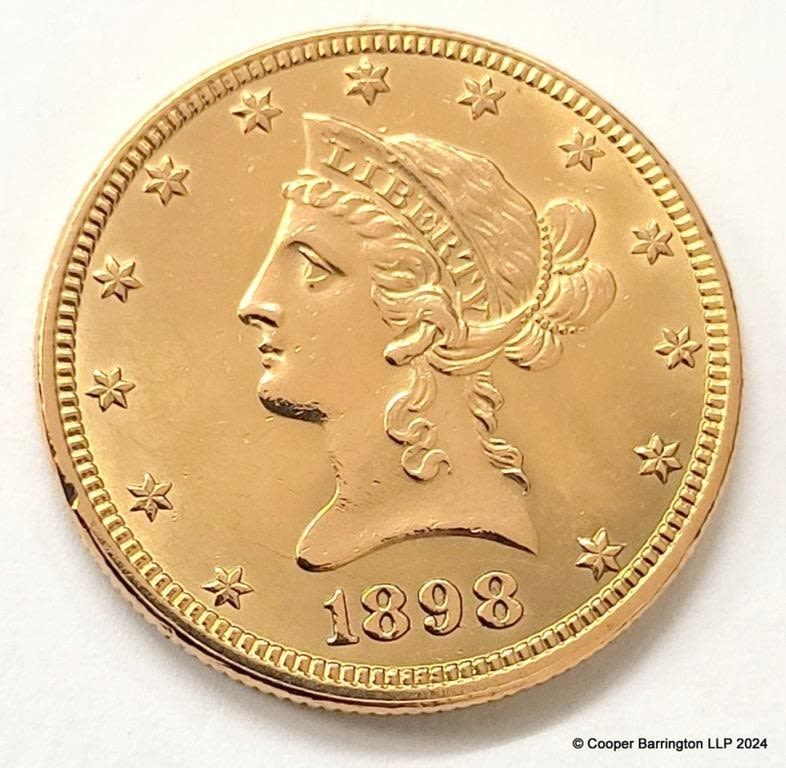 1898 Coronet Head Gold $10 Eagle New Style Liberty Head – With Motto. Minted at: Philadelphia (No Mint Mark). Uncirculated with lustre. 16.70 gms. Diameter: 27 mm