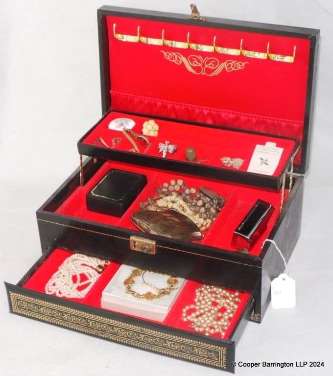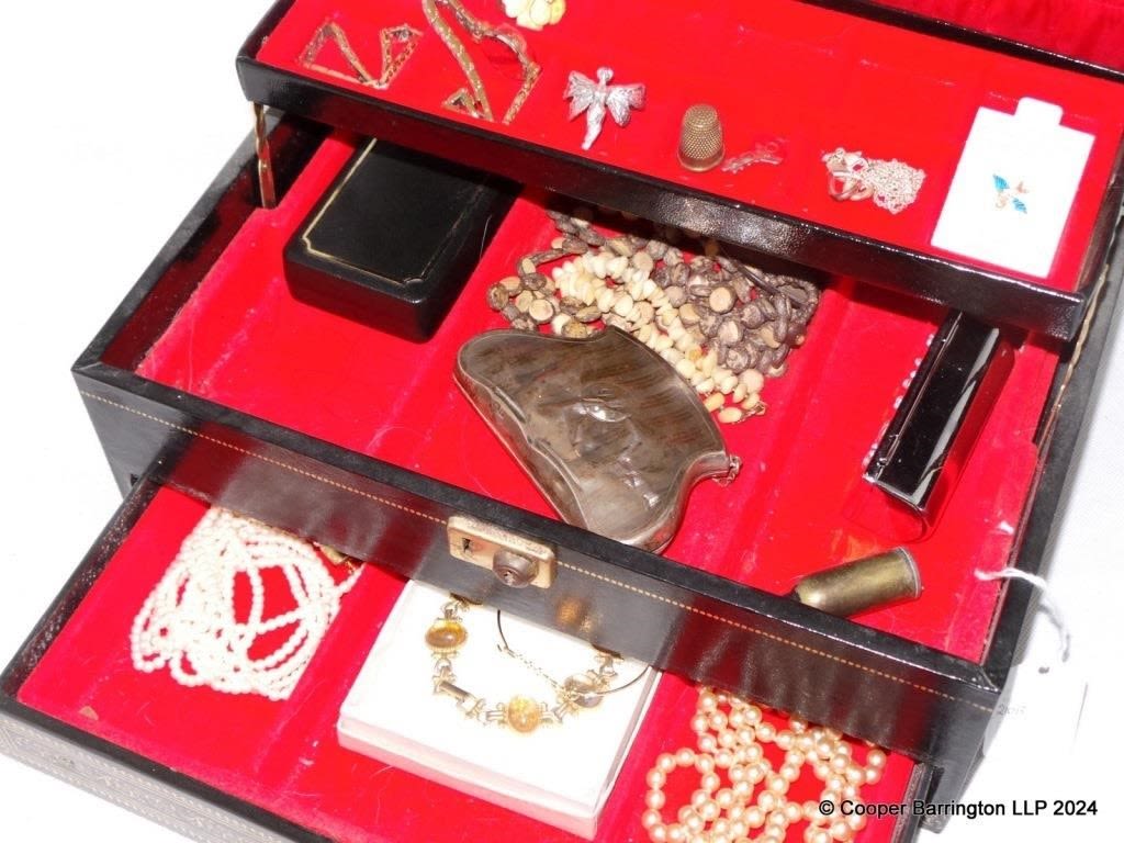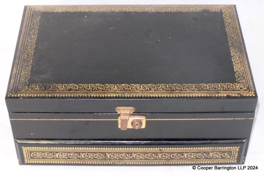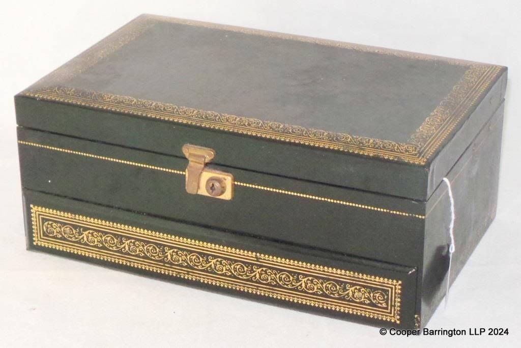 Vintage Mele USA Dark Blue Tooled Leather Jewellery Box with Automatic Drawer and Working Lock & Key. Complete with a quantity of costume jewellery.Silver Purse. f. Ingersoll Ladies Watch Etc. 32 x 20.5 x 13 cm