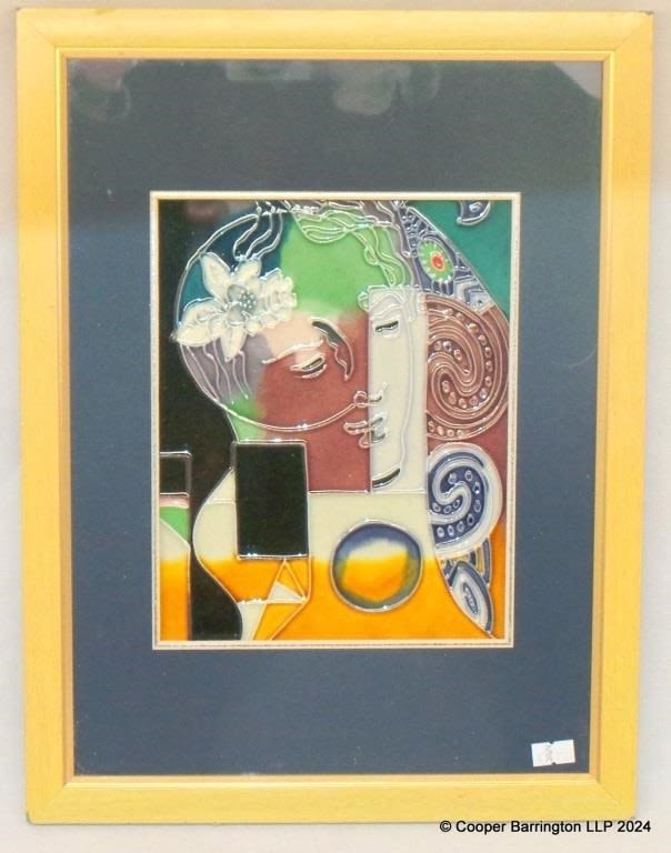 Abstract Hand Painted Glazed Ceramic Work of Art . Framed 32 x 42 cm.