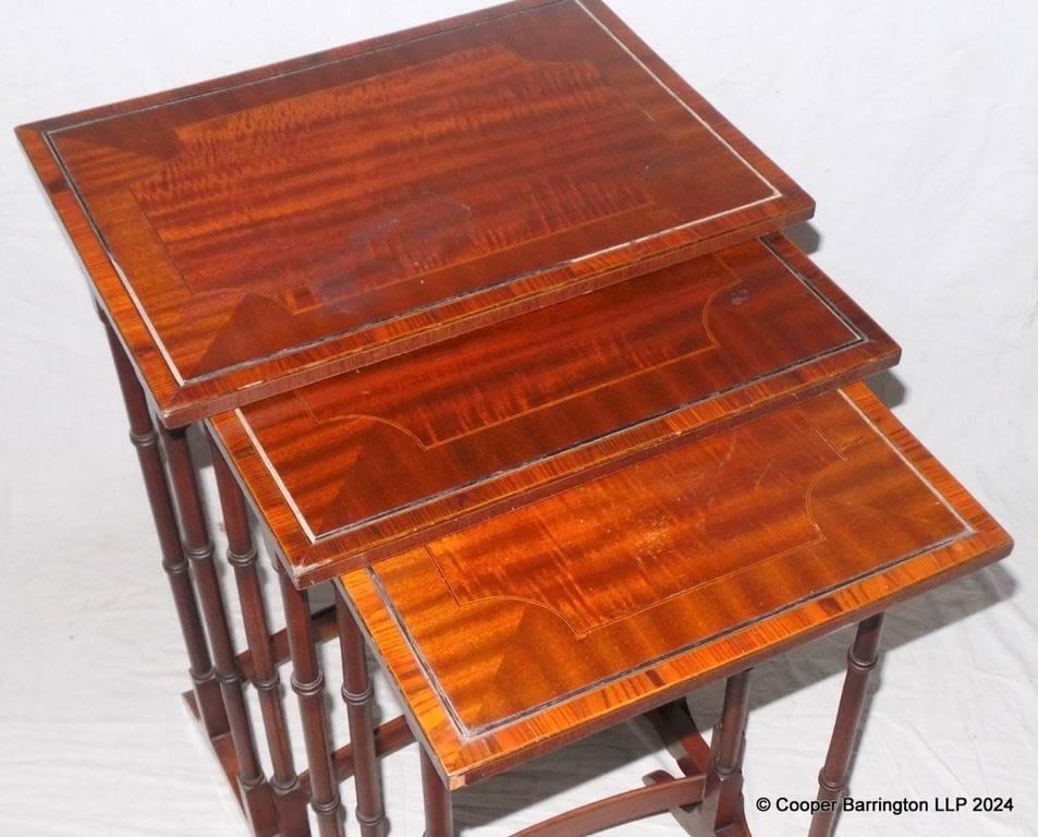 Edwardian Mahogany Crossbanded Nest of 3 Coffee Tables. Early 1900. Having raised bead around edge. All on bamboo style turned supports having bowed stretchers sitting on sleigh feet. Height 27 in. Width 17 3/4 in. Depth 12 3/4 in.