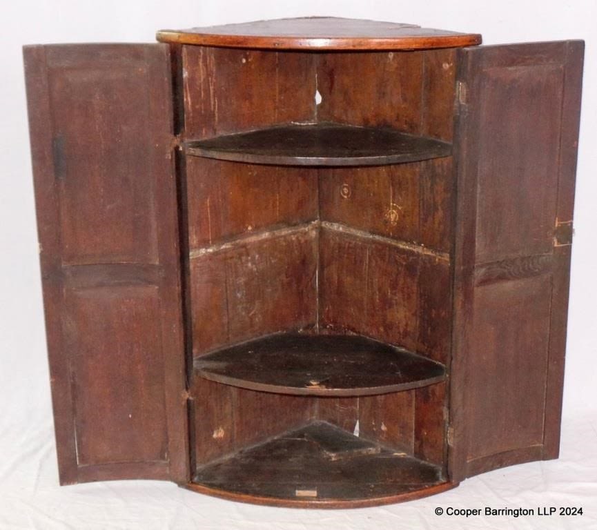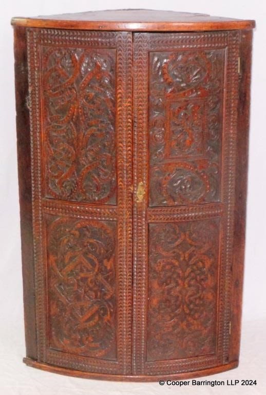 Georgian Oak Bowfront Carved Corner Cabinet. Early 19th Century. Height 38.5in, Width 25in, Depth 15in.