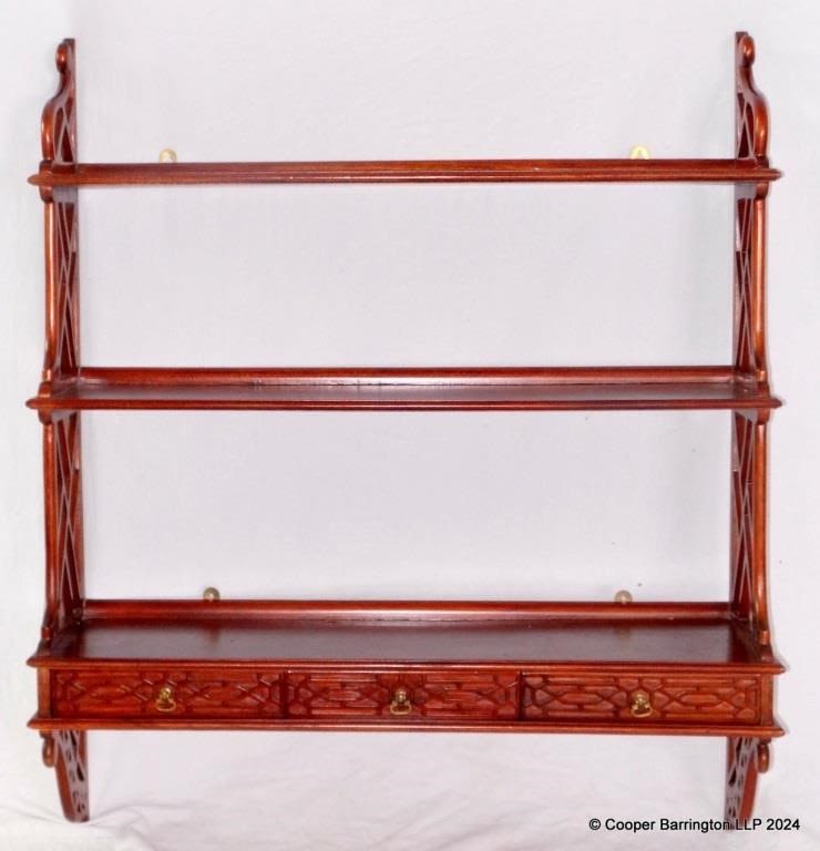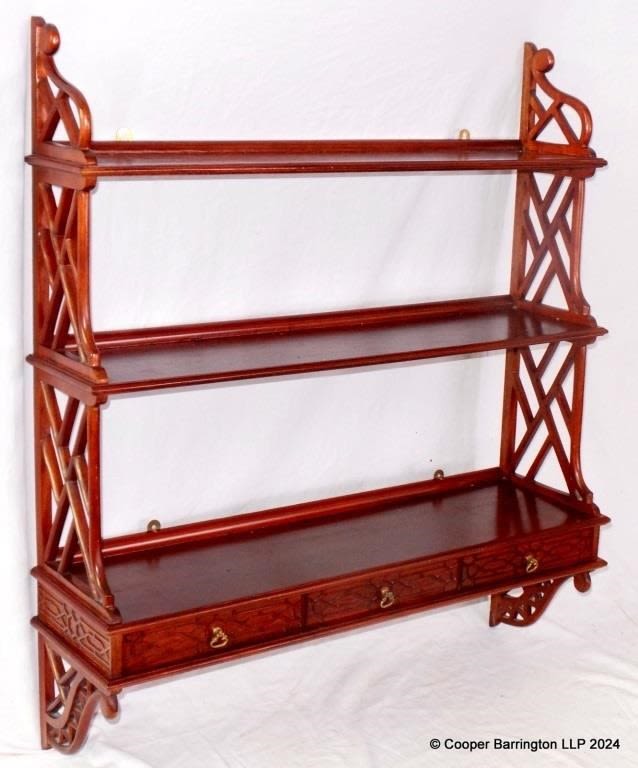 Vintage Carved Mahogany Waterfall Wall Shelves. 20th Century. Having three shelves over three drawers. Height 36in, Width 31in, Depth 9in.
