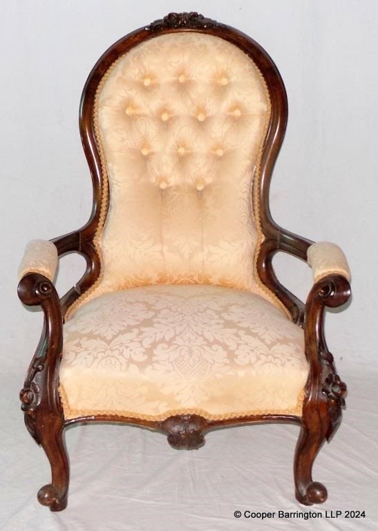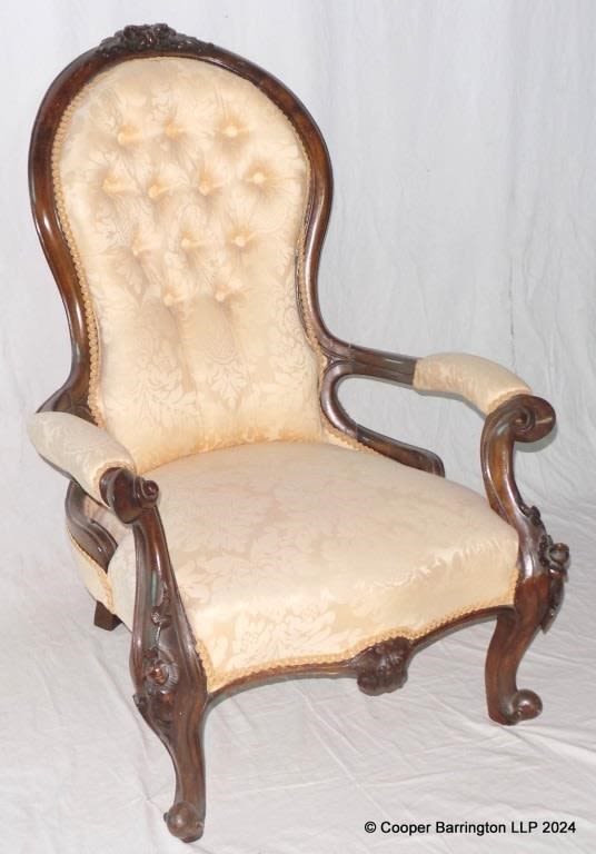 Victorian Button Back Mahogany Armchair. 19th Century. With carved accents, cabriolet front legs,upholstered in a cream brocade fabric. Height 38 inches.