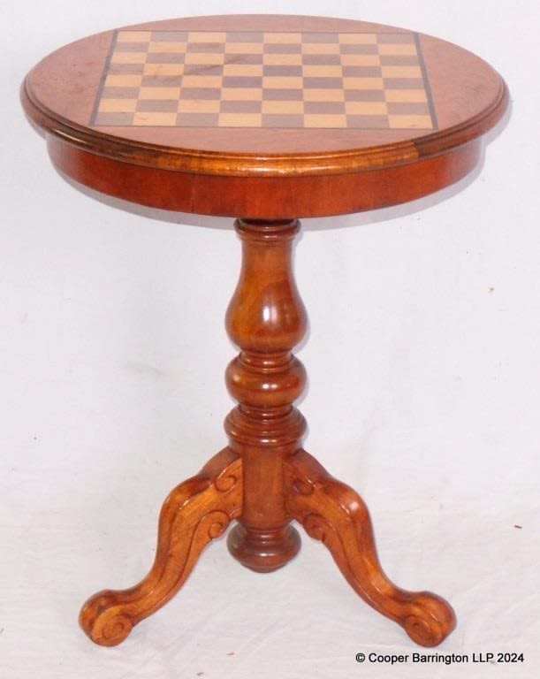 Victorian Style Mahogany Games Table. 20th Century. Circular form fitted with marquetry top raised on cabriole tripod base. Height 24in. Diameter 20in.