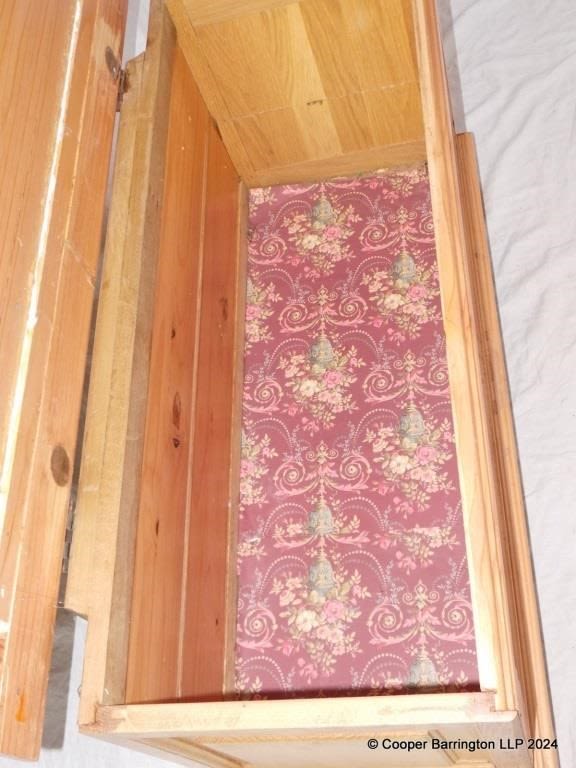 Vintage Pine Coffer with Decorated Lid. 20th Century. Height 20in, Width 35.5in, Depth 15in.