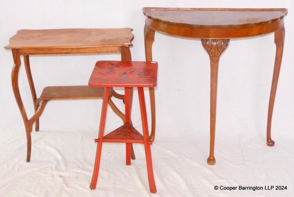Vintage Tables to include. Japanese painted lamp / side table. Demi Lune mahogany side table and a mahogany centre table with under-tier. Heights 22, 24 & 29 inches. (3 Items)