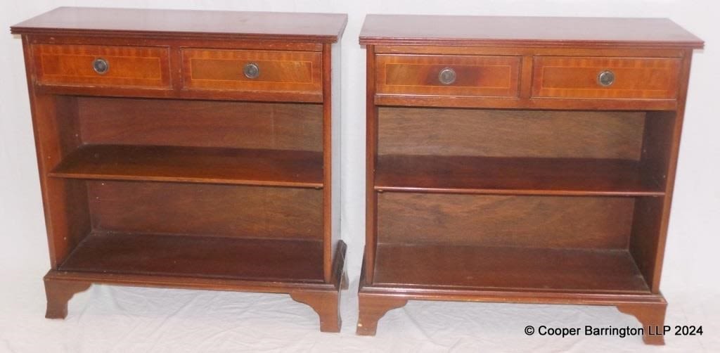 A Pair of Vintage Mahogany Two Drawer Hall Tables / Book Cases. 20th Century. Height 30.5in. Width 30in. Depth 11in. (2 Items)