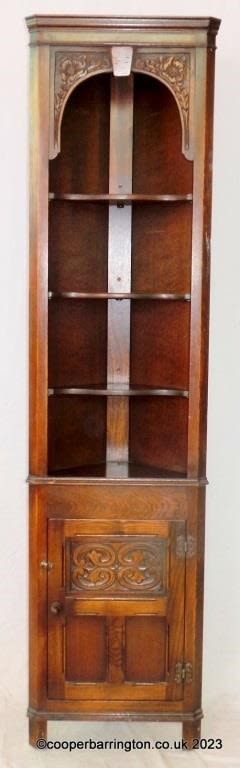 Jaycee Oak Narrow Corner Cabinet. Circa 1960s/70s. The moulded cornice over the carved arched top and three shelves,below a single carved panelled door all supported on style feet. Height 69.5 cm. Width 17.5 cm. Depth 9.5 in.