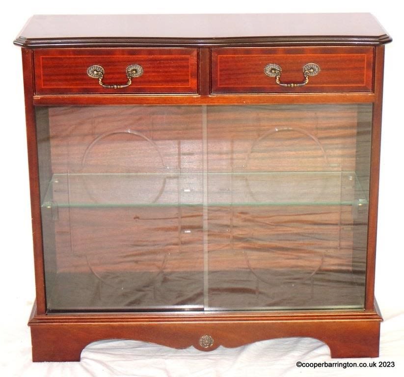 Vintage Mahogany Glazed Bookcase. 20th Century. The moulded top over two drawers fitted with brass swan neck handles over two glass sliding doors enclosing a single glass adjustable shelf all supported on a cut out plinth base. Height 28 in.. Width 30 in. Depth 10.5 in.