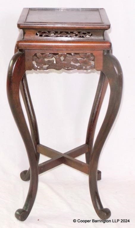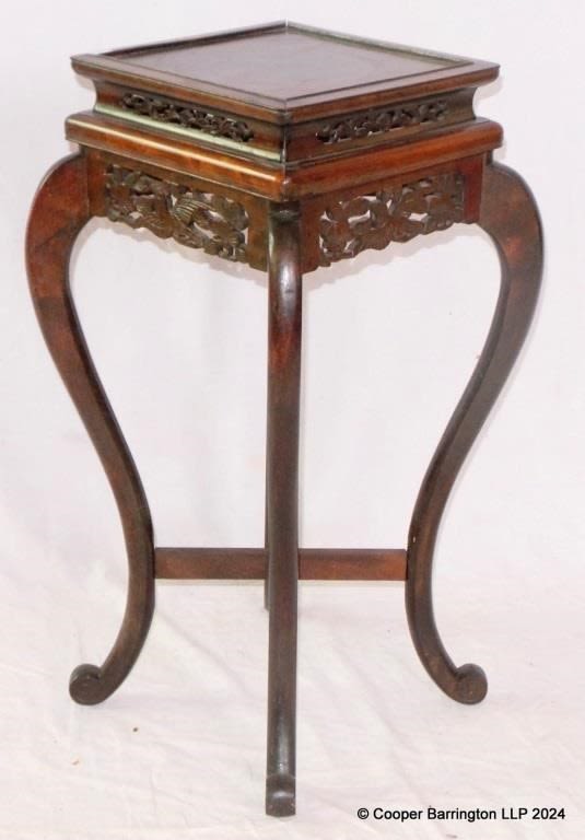 Antique Chinese Oriental Hardwood Plant/Jardiniere Stand Circa 1920. The moulded top with carved decoration over a fretted frieze on cabriole legs. Height 25 in, Width and Depth 13 inches