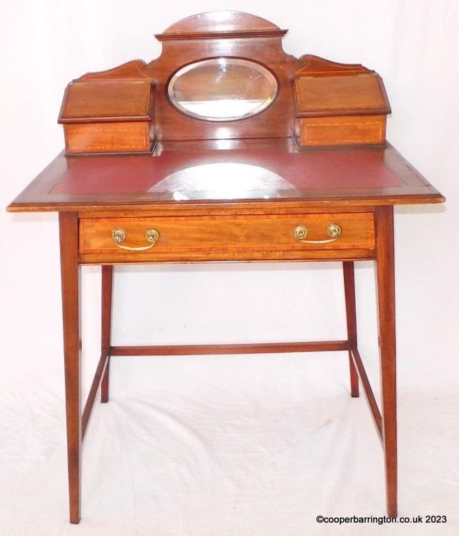 Edwardian Ladies Mahogany Writing Table. Early 1900s. The mirrored upstand back with two pen/document compatments over an inset leather writing surface. Below a single drawer with brass swan neck handles all supported on tapered legs . Height 39 in. Width 30 in. Depth 19.5 in.