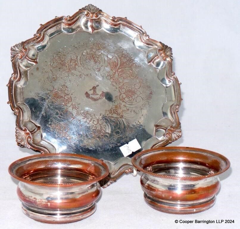 Antique Sheffield Silver Plated Salver with Armorial and Two Wine Coasters. Early 1900. (3 Items)