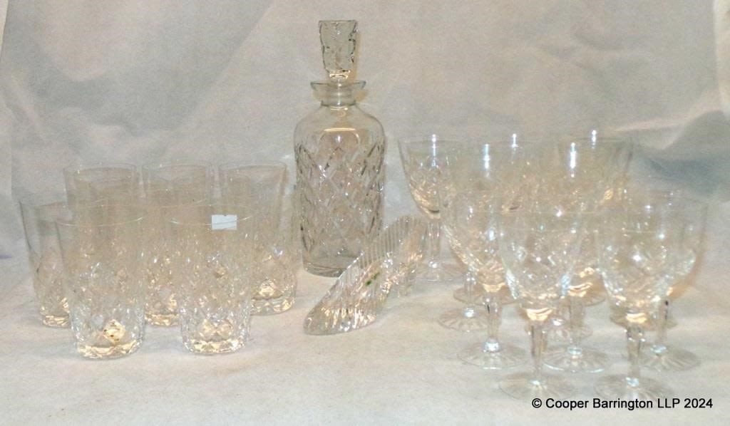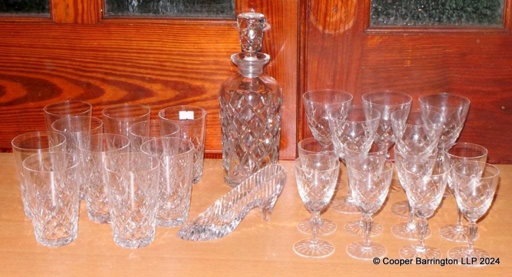 Vintage Crystal Decanter. Eight Sherry. Five Wine. Ten Tumblers Also a Galway Irish Crystal Shoe. (25 Items)