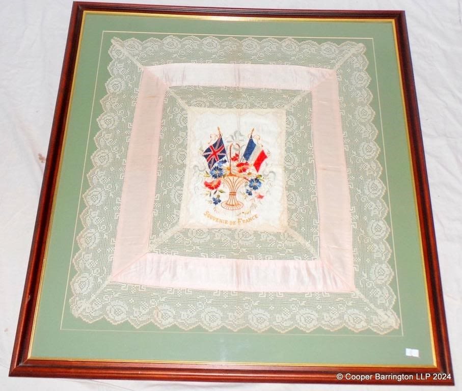 WW1 Patriotic England & France Needlework and Lace Tablecloth Souvenier of France. Early 1900s. Framed under glass 80 x 86 cm.