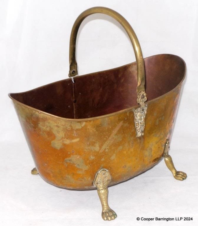 Antique Hammered Brass Coal Scuttle with Lion Mask Swing Handle Terminals Raised on Lion’s Paw Feet. 48 x 30 cm.