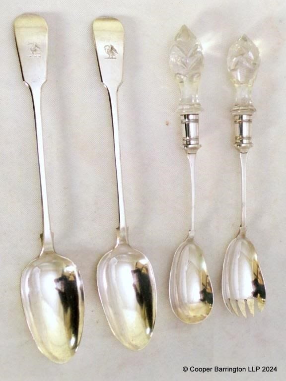A Pair of Victorian Silver Plated Basting Spoons by Edward & John Barnard. Circa 1860s. Length 32 cm. Also a pair of 1920s cut crystal and silver plate salad servers. Length 29 cm. (4 items)