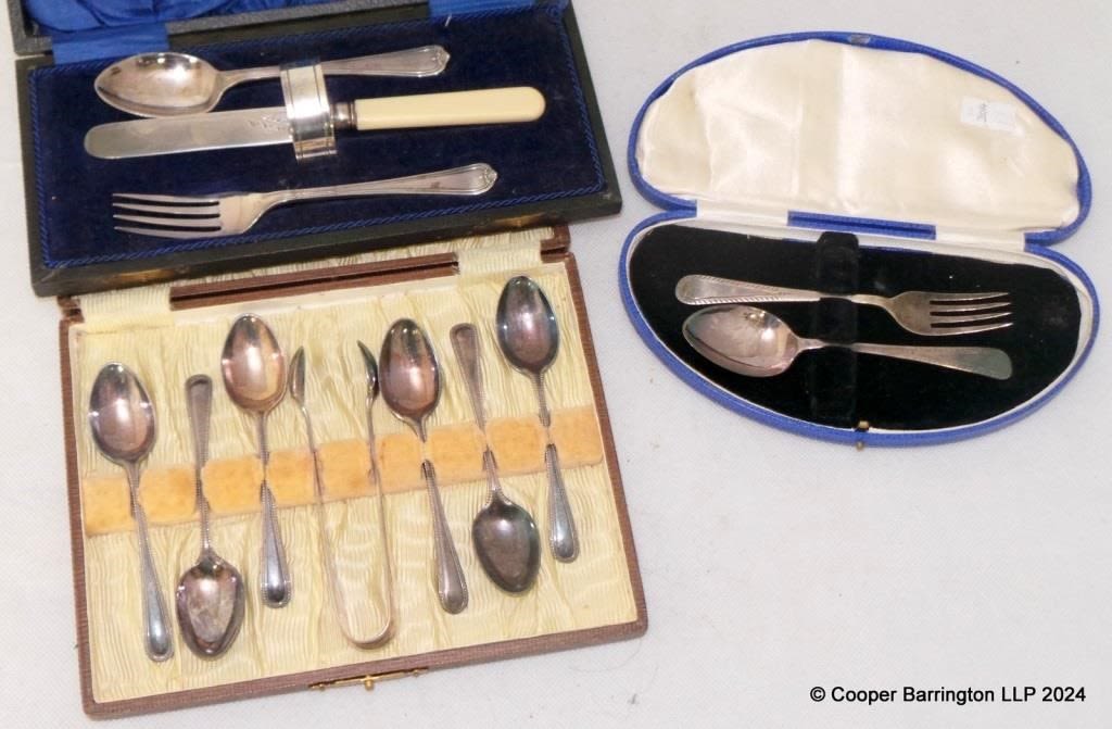 Cased Antique Silver Plated Flatware to Include: Christening Set/Napkin Ring. Teaspoons / Sugar Tongs. Etc. (3 Items)