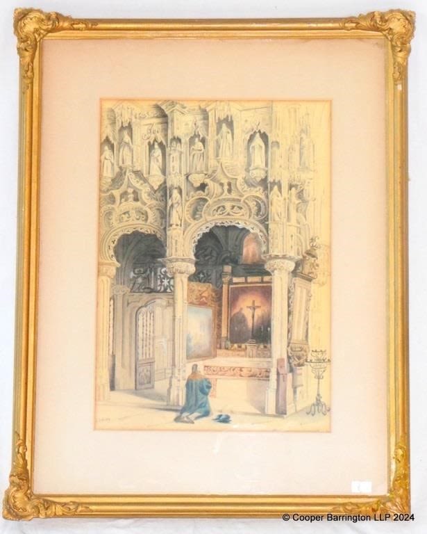Antique L J Gilby Watercolour Painting Rood Screen in Parish Church, Dixmude (Diksmuide), Belgium. Signed L J Gilby lower left. Gilt framed under glass 45 x 58 cm