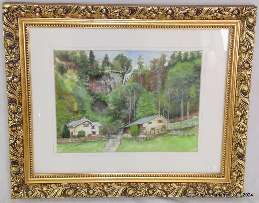 H E McInroy ACIB FSCA (Oswestry) Llanrhaeadr Waterfall Watercolour Painting. Circa 1999. Signed lower left H McInroy 99. Title to verso. Gilt framed under glass 60 x 50 cm.