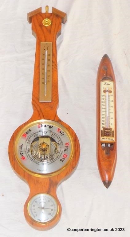 German Democratic Republic 1949 to 1990. (GDR) Aneroid Banjo Barometer. Also a Tolni thermometer mounted in a Henry Mills & Sons Tottington Weaving Loom Wooden Shuttle Bobbin. Working order. (2 Items)