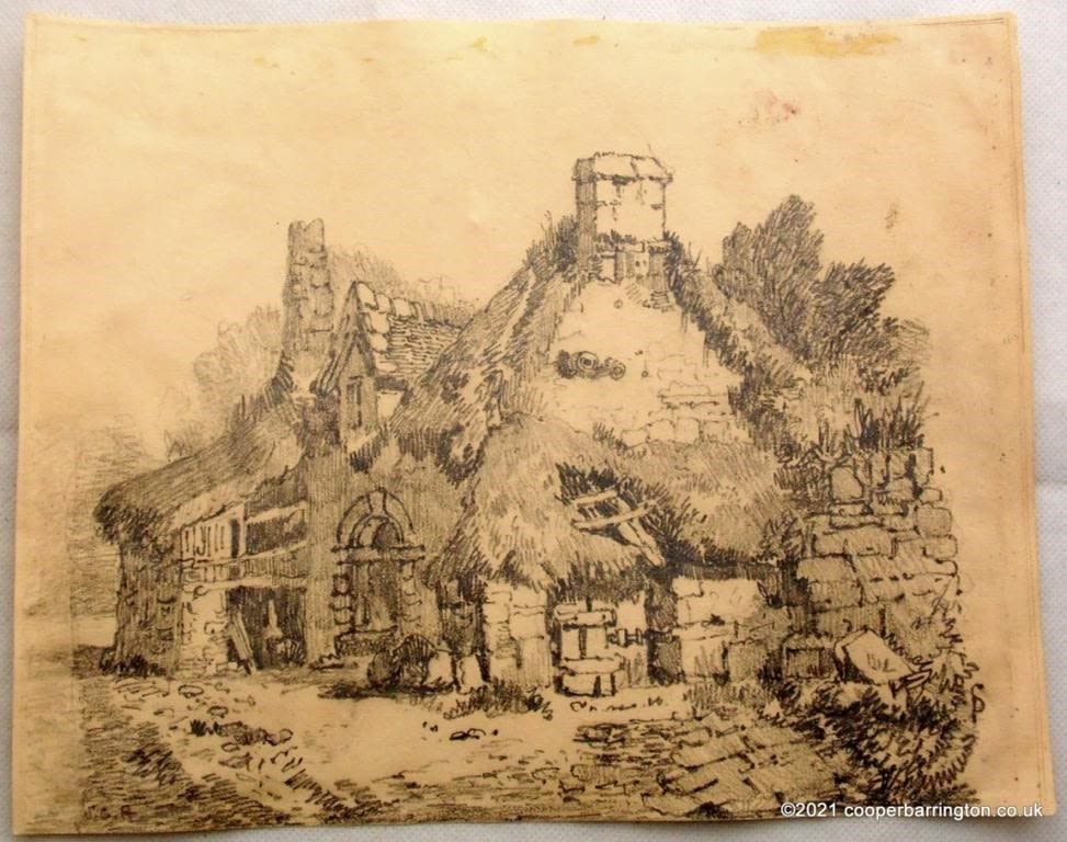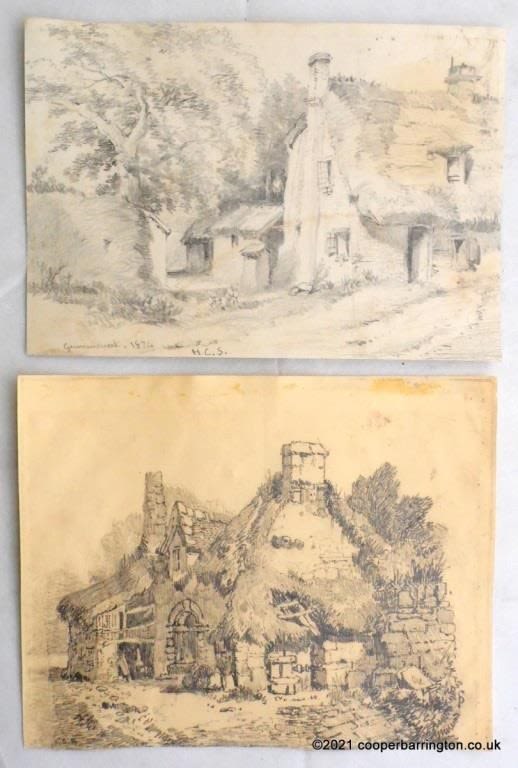 Samuel Gillespie Prout 1822-1911. Original Sketch Drawing,’Thatched Cottage’. Monogrammed SGP lower left. Unframed 25 x 20 cm. Also one other sketch by Mrs H Clarendon Smith RI. Monogrammed and Dated 1874. (2 Items)
