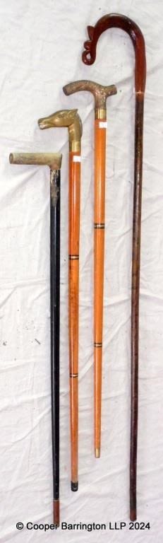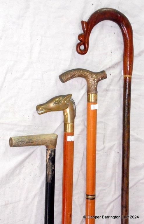 Collection of Walking Canes to Include. Brass Horse Head . Brass Antique Style. Shepherds Crook . Horn Handle. (4 Items)