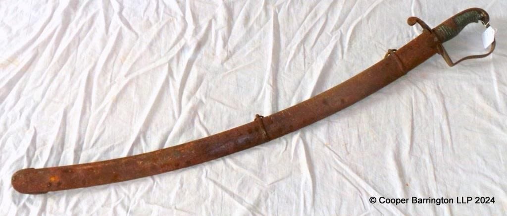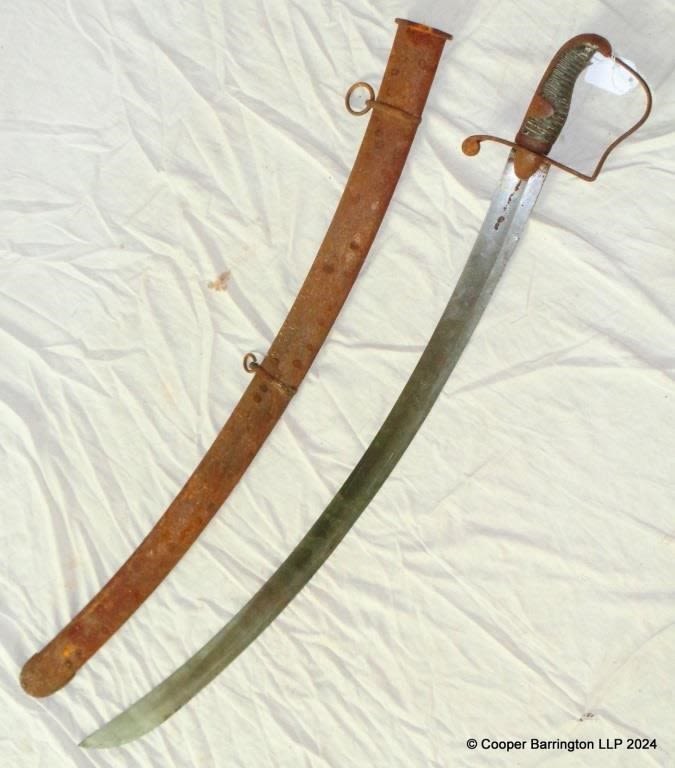 An Officers1796 Pattern Light Cavalry Fighting Sabre and Scabbard. Curved fullered blade in good condition probably by J. Johnston, Newcastle Street, The Strand, London. Length 37 inches.
