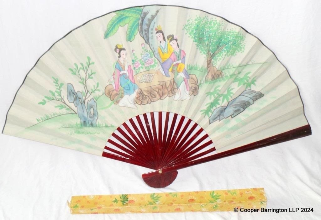 Boxed Vintage Large Japanese Hand Painted Wall Fan on Lacquered Wood Frame. Japanese women playing checkers. 132 x 30 cm.