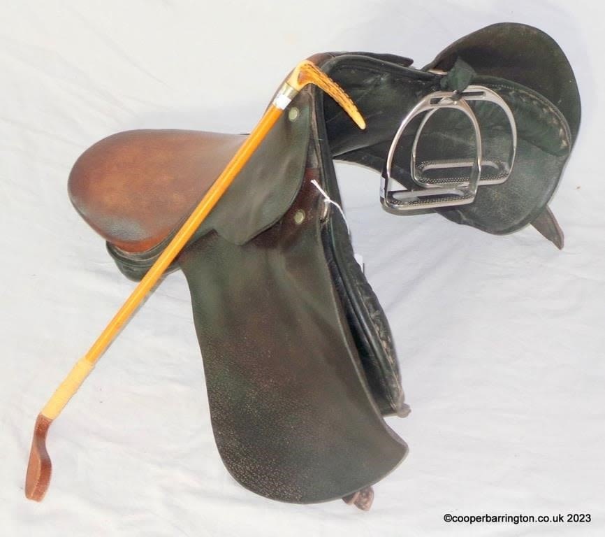 Pony Saddle with Antique Antler Handled and Malacca Riding Crop with Nickel Silver Collar. Also a Pair of Stirrups. (3 Items)