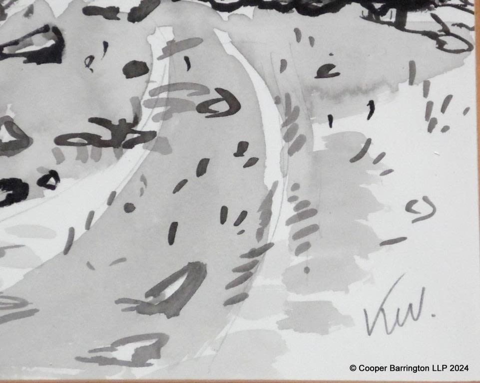 Sir Kyffin Williams R.A. (1918-2006) Rural Welsh Farmhouse Landscape Ink and Wash. Signed with initials ‘KW.’ (lower right) in pencil. Gold metal framed under glass 41 x 44 cm.