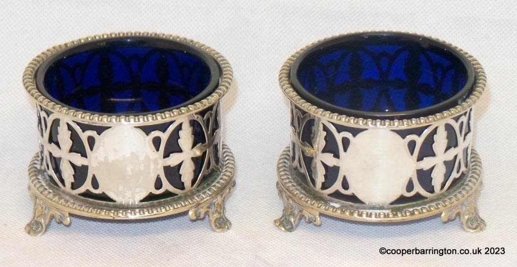 A Pair of Antique Silver Plated Pierced Salts with Blue Glass Liners and Vacant Cartouch. Early 1900s. Diameter 8 cm.