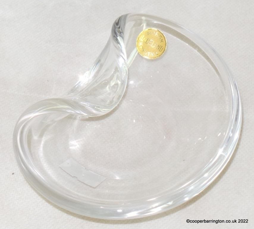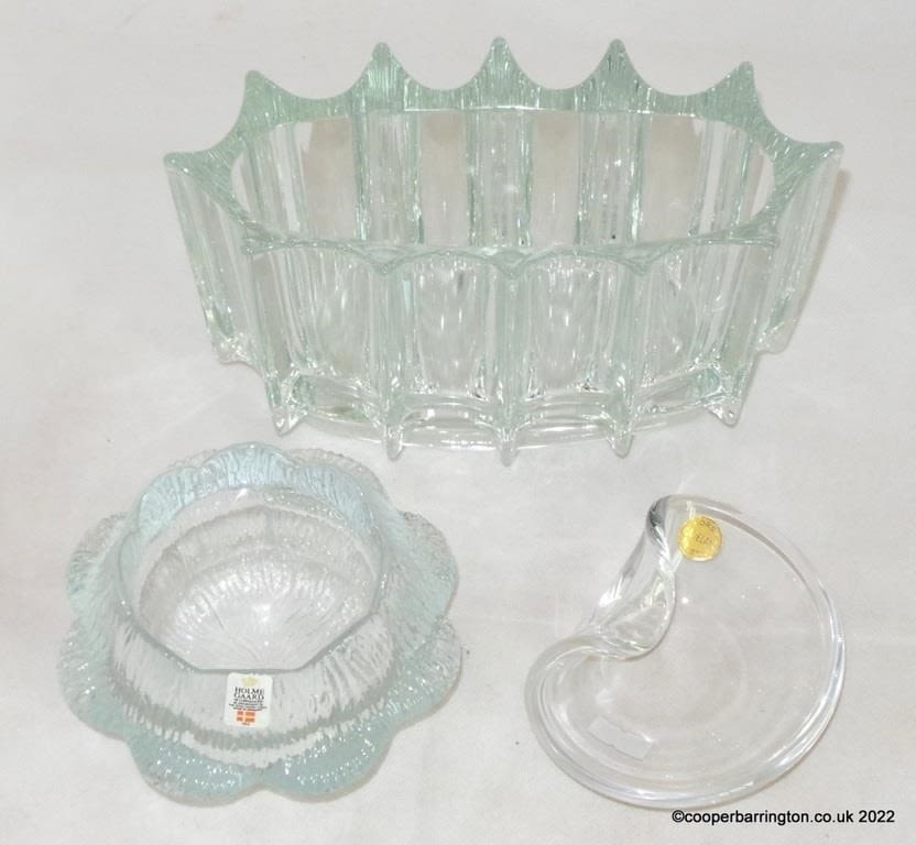 Bohemian Czech Sklo Union Art Glass Vase Jardiniere by Rudolf Jurnikl. 21 x 10 x 12 cm. Norwegian Bergen Line Railway Hadeland Glass Ashtray for the Bergen Line with Label. Also a Holmegaard Copenhagen Textured Glass Flower/Water Lily Tea Light Bowl with Holmegaard Label. (3 Items)