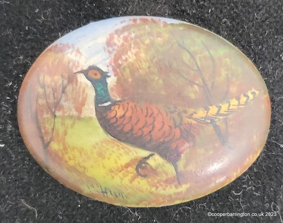 A Pair of Scarce Signed Minton Handpainted Enamelled Pheasant Plaques by Reuben Hague (1888-1969). Gilt framed 10.5 x 10.5 cm. (2 Items)