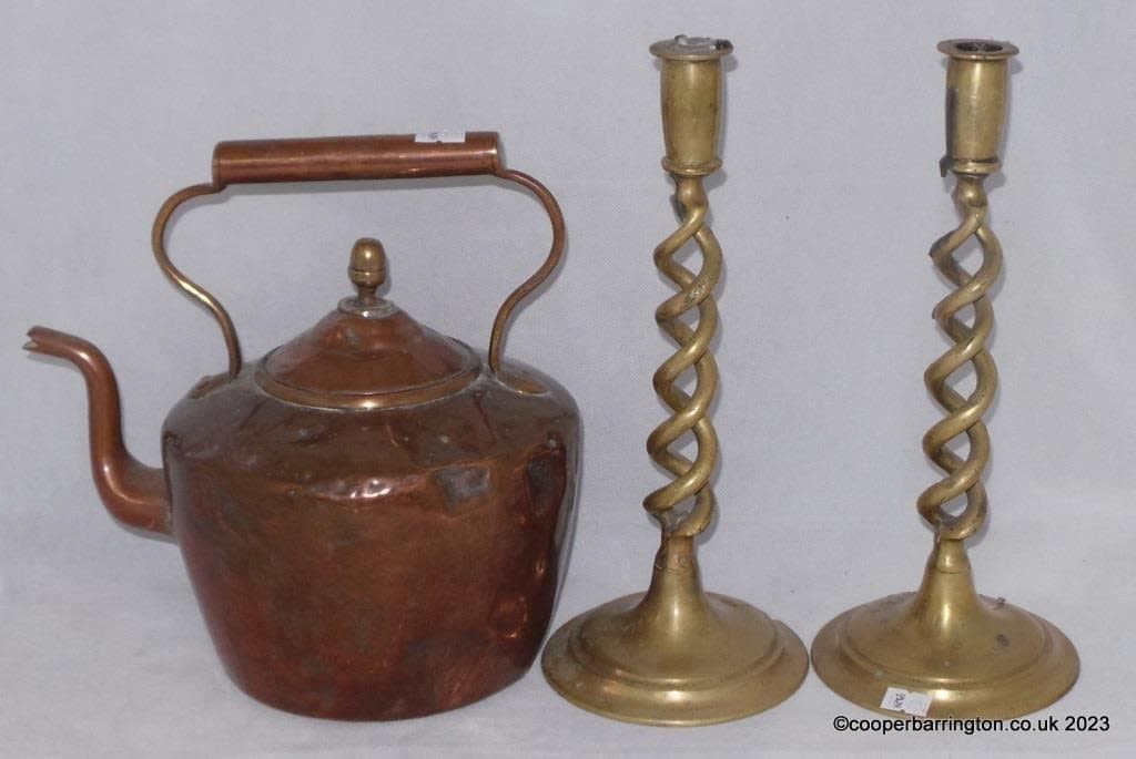 A Pair of Antique Solid Brass Open Barley Twist Candlesticks. Early 1900s. Height 30 cm. Also an antique copper kettle with acorn finial. Height 25.5 cm. (3 items)