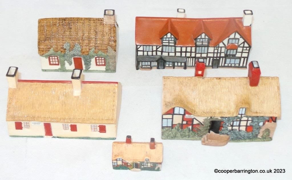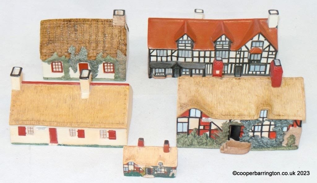 Five William Henry Goss Porcelain Pastille Burners. Model of Robert Burn’s Cottage1893. Shakespear’s House 1895. Ann Hathaway’s Cottage 1894. Manx Cottage 1897 and Miniature Ann Hathaway’s Cottage 1894. (5 items)