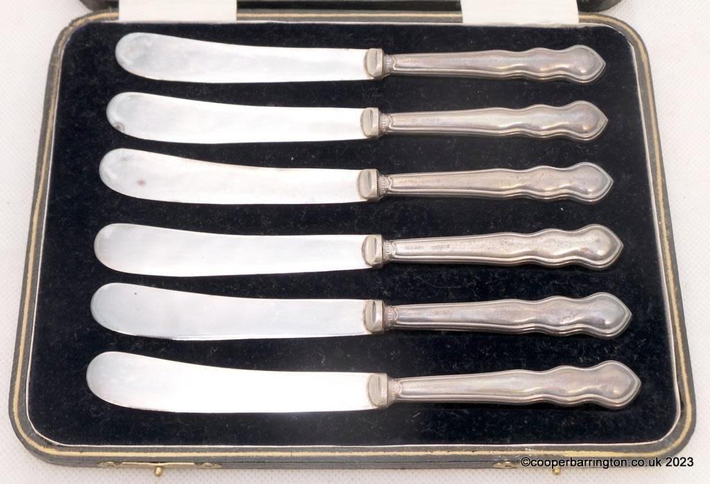 KGV Cased Set of Sterling Silver Mounted Butter Knives by Harrison Fisher & Co. Hallmarked Sheffield 1924.