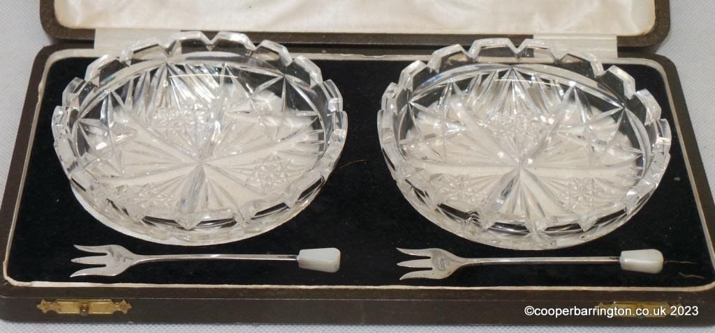 Cased Viner’s Ltd Cut Crystal Pickle Set with Sterling Silver/Mother of Pearl Pickle Forks. Hallmarked Sheffield 1937.